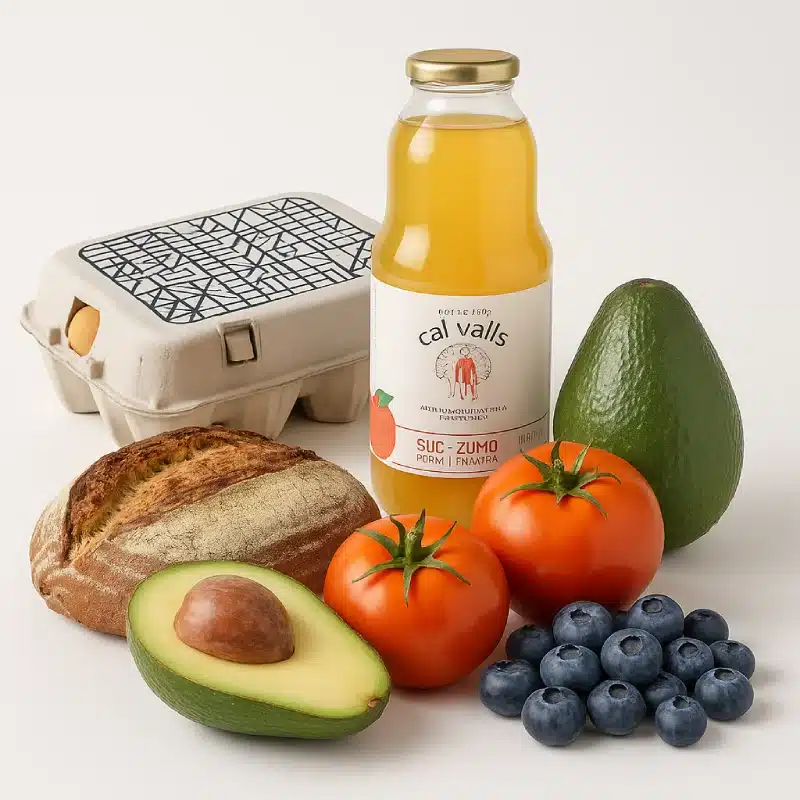 El placer de un buen brunch en casa. Pan artesanal, fruta fresca y jugosa, huevos de granja y un zumo natural que pone la chispa al día. Una cesta pensada para disfrutar sin prisas, con sabor auténtico y energía saludable.